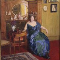 Sitting lady In blue dress In salon. Oil on mahagony board. Signed and dated 1919 at bottom right