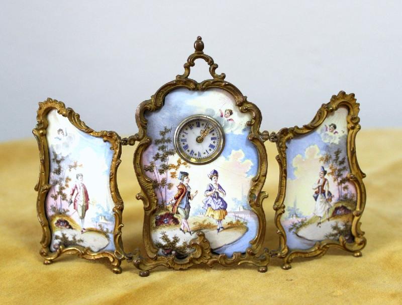 | | Popis: | Small clock screen with porcelain applications, hand-painted and bronze montage. Viennese work from 1890.